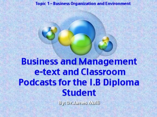 International Baccalaureate Business and Management Companion e-Textbook and Classroom Podcasts - Module 1 Business Organization and Environment Description:Product DescriptionThis is Topic 1 - Business Organization and Environment of the International Baccalaureate Business and Management Syllabus for first examinations in 2009 and a companion guide to the diploma examination. This e-text is written from 15 years of practical experience teaching the course to students in different countries and is provided at no revenue to the author. It is essentially available at cost. Included in the introduction is access to actual Classroom Lectures in the form of Podcasts. http://drmullibusinessmanagement.wikispaces.com/IntroductionProduct DescriptionThis is Topic 1 - Business Organization and Environment of the International Baccalaureate Business and Management Syllabus for first examinations in 2009 and a companion guide to the diploma examination. This e-text is written from 15 years of practical experience teaching the course to students in different countries and is provided at no revenue to the author. It is essentially available at cost. Included in the introduction is access to actual Classroom Lectures in the form of Podcasts. http://drmullibusinessmanagement.wikispaces.com/Introduction