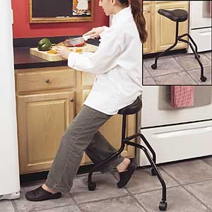 Roll-about stool has a sturdy three legged design. Wheels for easy mobility. Padded vinyl seat has 5-level height adjustment for comfort. Great for kitchen, workroom and more. Metal tube frame, 27 x 24".